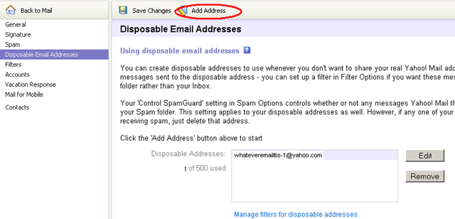 2. Click on “Disposable Email Addresses” on the left side menu, and follow the Yahoo! instruction to set up your disposable email address.